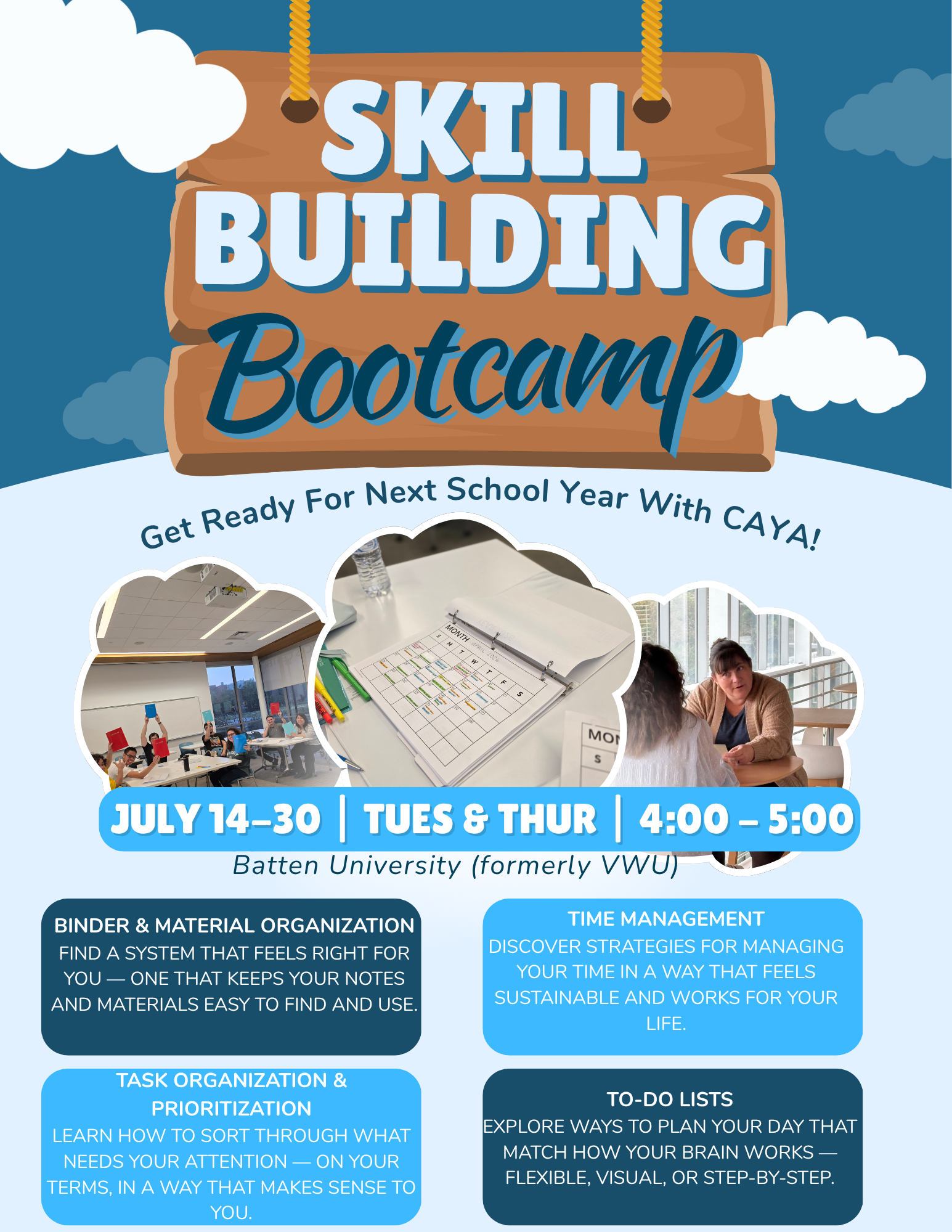 BRIDGE Bootcamp is a 6-module, 3-week program for students preparing to transition into high school or college. This program is for every kind of learner who wants support building skills to manage their time and tasks as they take on more responsibility as a teen or young adult.
